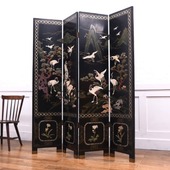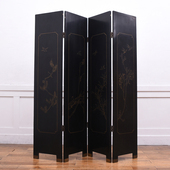 様々なモチーフが綿密に描かれた存在感を放つ一品。角度や光加減によって見え方が異なる大変存在感のある衝立です。